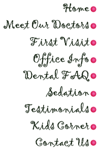Home   |   Meet Our Doctors   |   First Visit   |   Office Info   |   Dental FAQ   |   Sedation   |   Testimonials   |   Kids Corner  |  Contact Us